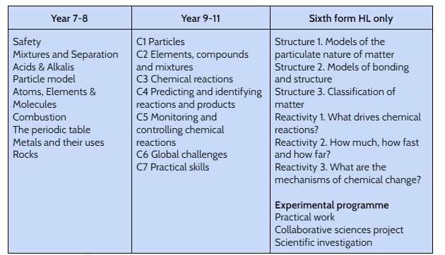 Chemistry is often considered to be the central Science being used to explain the complex reactions that occur in biological systems as well as explaining why materials behave in a certain way. The course covers the traditional aspects of Chemistry as well as exploring the concepts of Green Chemistry and sustainable development. Chemistry allows students to understand why and how things happen in the world around them and gives some understanding of how it can be used to help shape a better future world. The students would be equipped with the tools to work scientifically; analyse, communicate, enquire and solve problems with confidence.