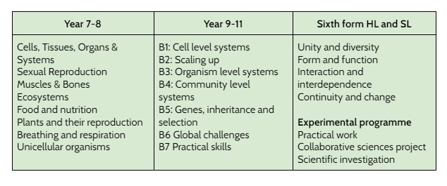 In Biology students study living organisms and how they interact with the world around them. In order to gain an in-depth understanding of the living world, studies are conducted at the molecular level within cells, building up to tissues, organs and organ systems and then studying whole organisms and how they interact in ecosystems.