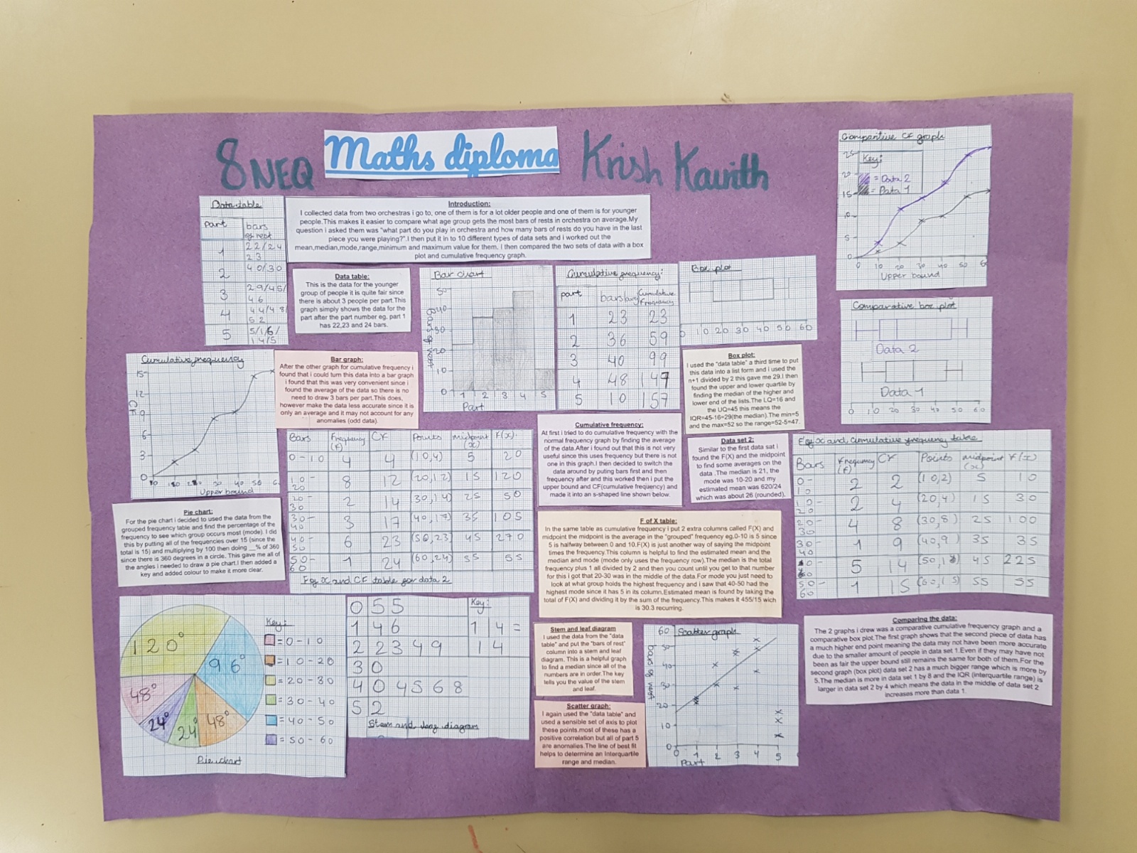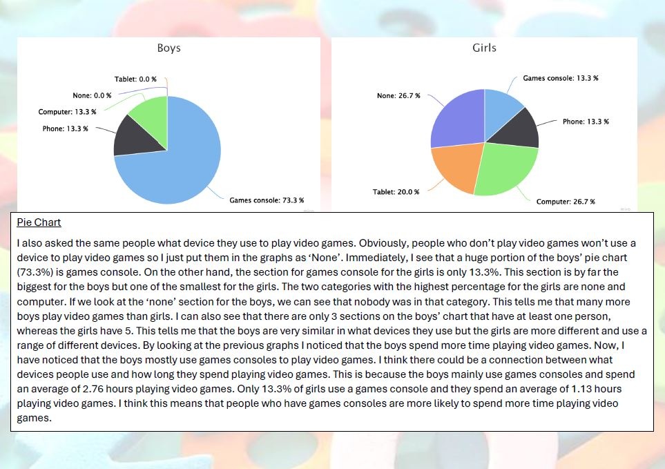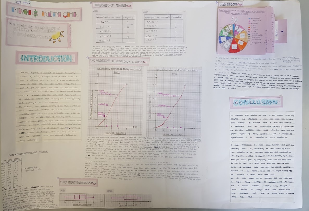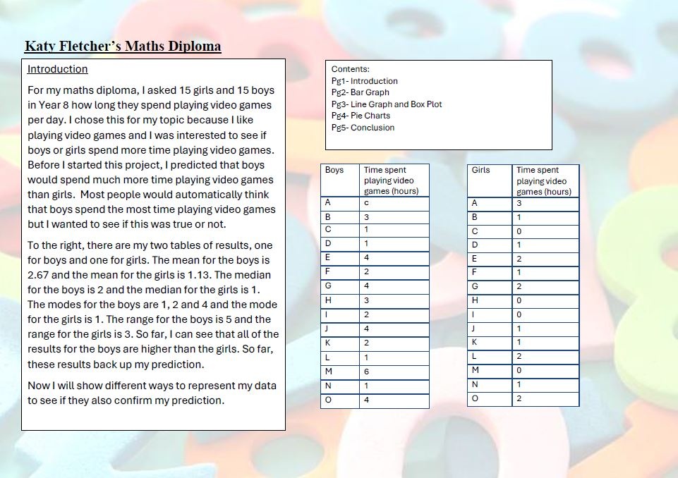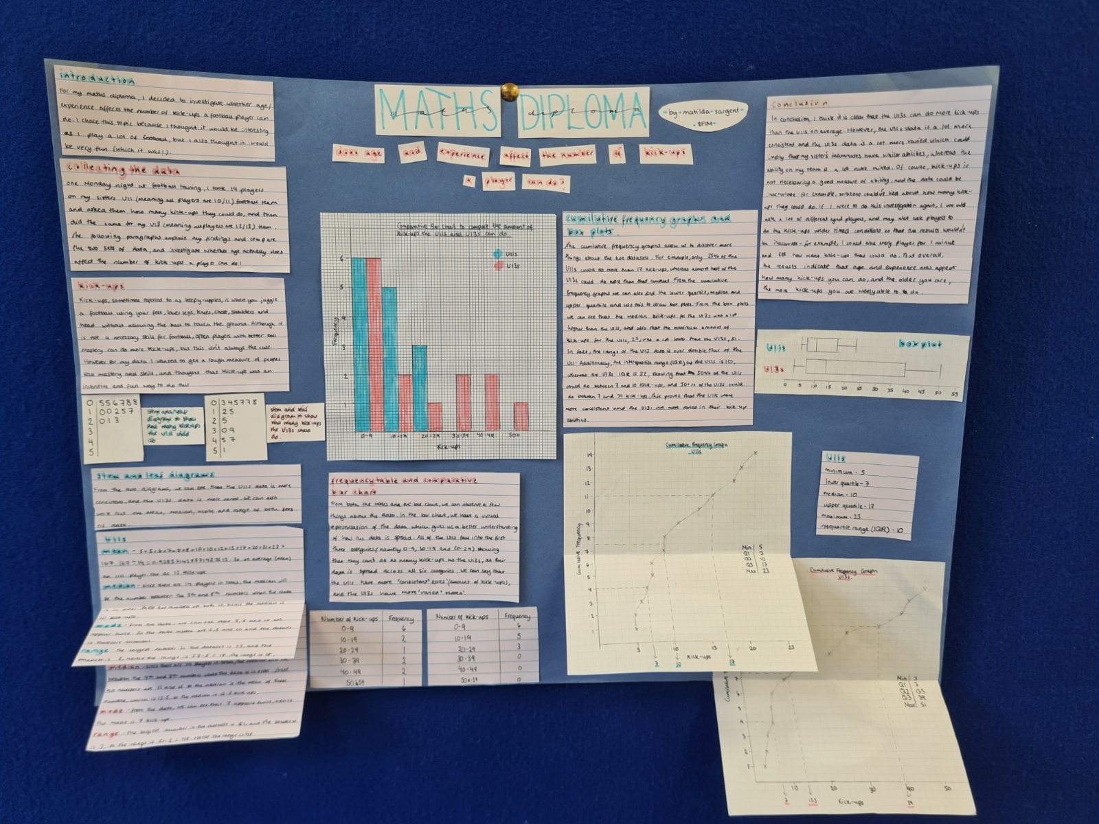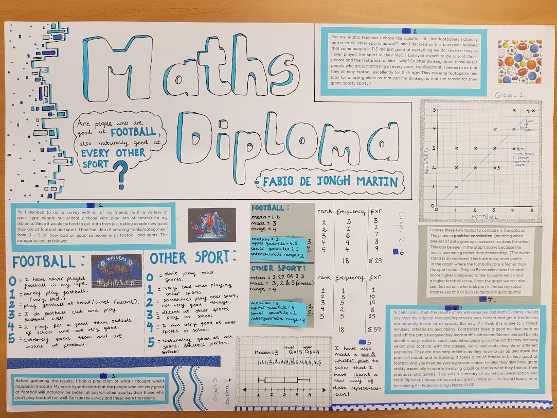 For their Maths Diploma, Year 8 students were tasked with a statistical investigation of data which they had researched and/or collected themselves. Our hardworking students came up with some intriguing ideas - from asking their friends to identify their favourite food, to looking at the numbers associated with their favourite sports team or video game, to measuring how many kick-ups students of different ages can perform on the football pitch!