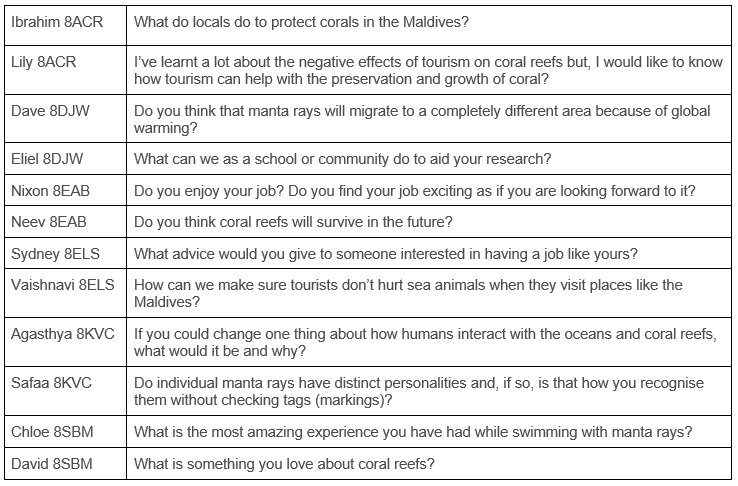 Inspired by the special work of marine biologist Chloe in the Maldives, each class explored these incredible ecosystems and prepared their most curious questions.