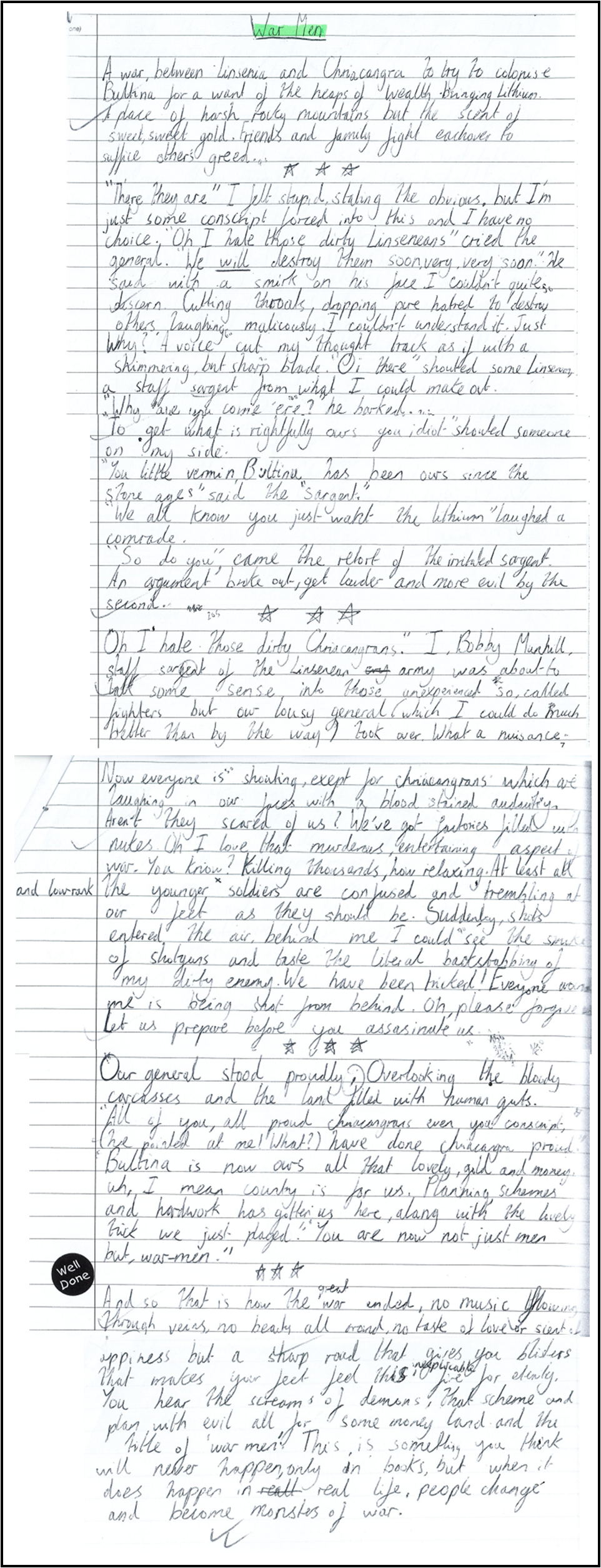 All Year 7 students also took part in the 500-word Short Story Competition (an idea ‘borrowed’ from the BBC!). Five Year 12s deliberated long and hard over the shortlisted stories, and finally agreed on a winner. Congratulations to Lily Popova in 7ACR for her fantastic story War Men (see full story below). Well done to the winners and everyone who took part. The English Department, Mrs Carey and the English prefects were all really impressed with the creativity and imagination of all the entries in the various competitions.