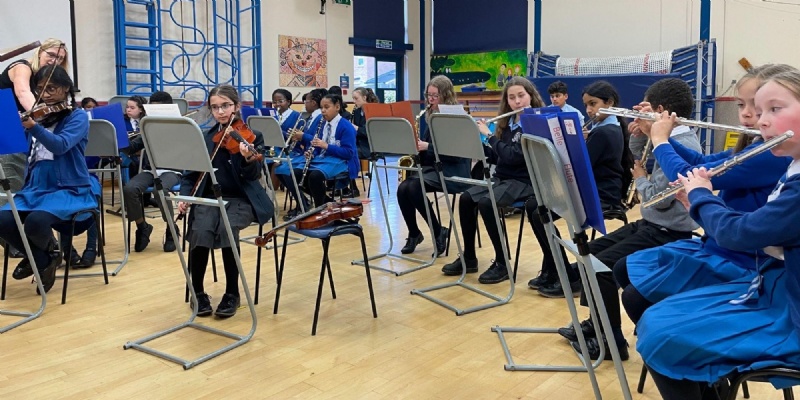 On Tuesday 12th March, 12 students from our KS3 Orchestra visited St Stephen’s Primary School to rehearse in advance of our upcoming concert on Monday 18th March. We rehearsed ‘A Whiter Shade of Pale’ with around 20 students from the Primary School, with our musicians shadowing on each of the parts.