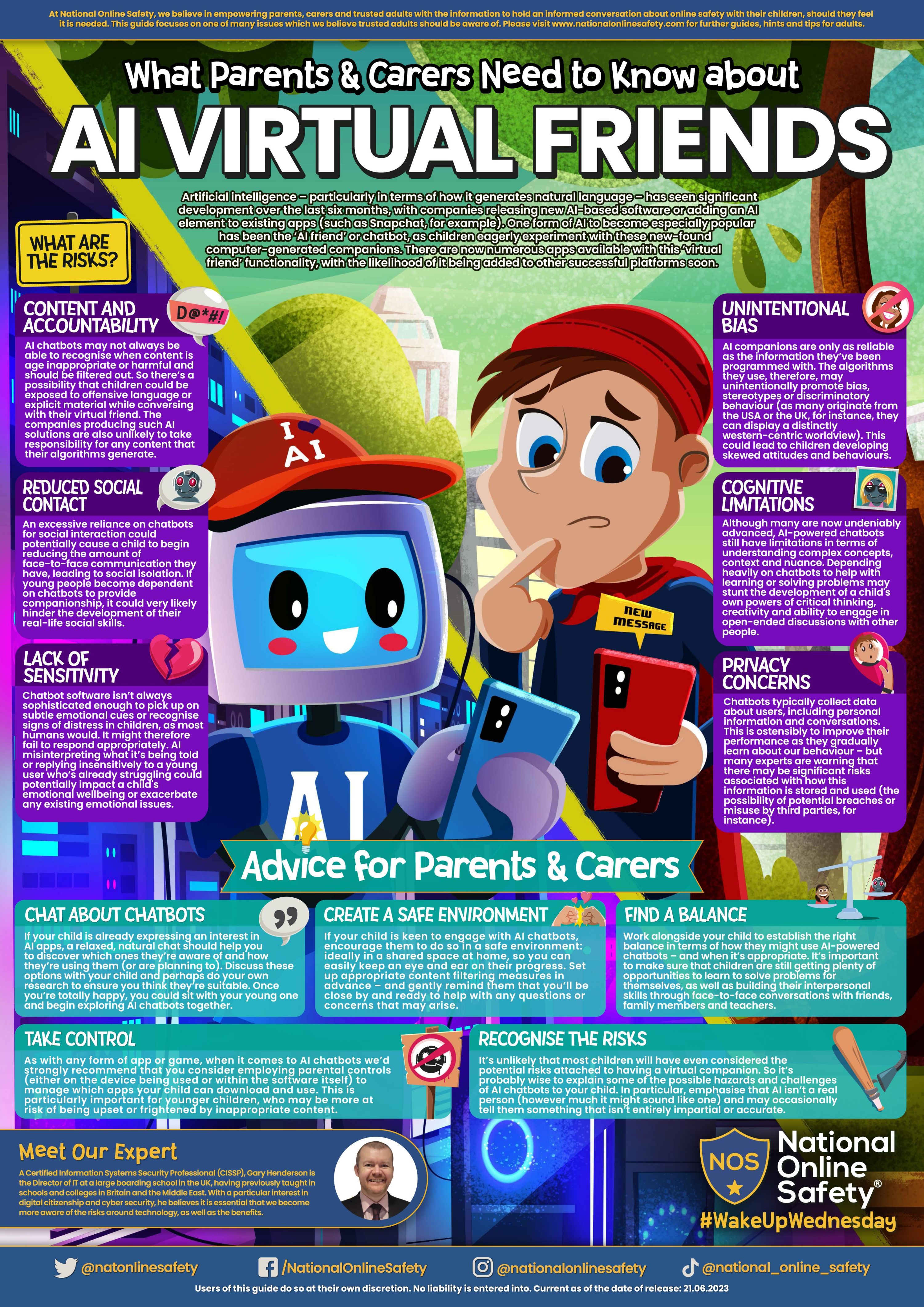 National Online Safety have produced this handy guide for parents to consider what carers and parents need to know about AI Virtual Friends.