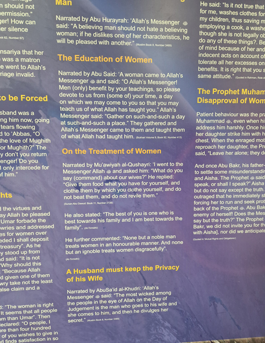 The exhibition underneath the prayer hall was also very informative, as various topics were discussed, such as Muslim attitudes towards the environment and women’s rights. There, we learnt that women’s rights and equality are actually at the heart of Muslim beliefs, which really challenges the common misconceptions about Islam as oppressive towards women.