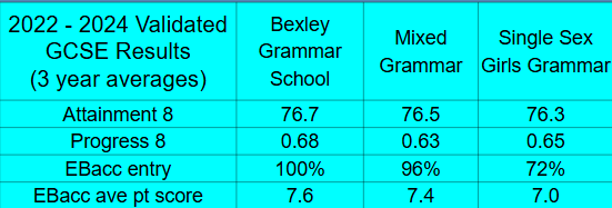 *Unvalidated GCSE data by gender for the four grammar schools in Bexley. (This data is also available, school by school, https://www.find-school-performance-data.service.gov.uk/