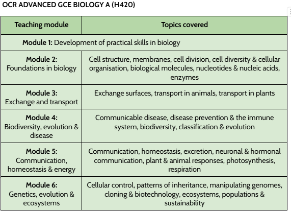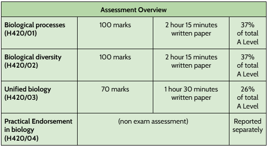 External assessments take place at the end of the two year course. Students must complete all components (01, 02, 03 and 04) to be awarded the OCR A Level in Biology A.