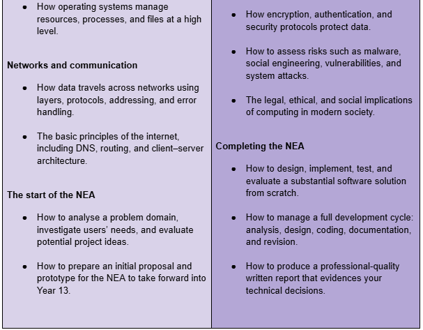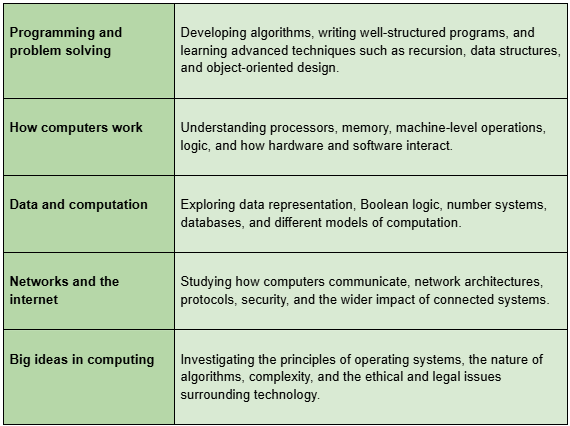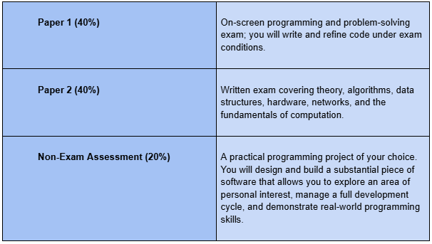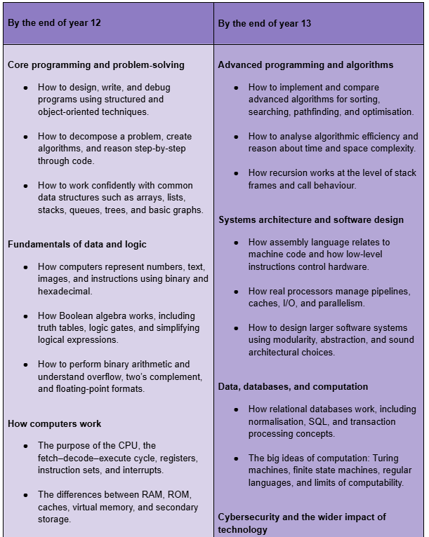 Computer Science is the subject that teaches you to think clearly, solve complex problems, and understand the technology shaping every industry. Whether you’re interested in engineering, medicine, finance, design, science, or running your own business, the analytical and creative skills you gain here open doors everywhere. It is a foundation for any modern career, including but definitely not limited to, software development. A Level Computer Science offers a rigorous and practical study of how computers work, how they are used, and how to solve problems effectively through programming. The course will suit you if you enjoy logical thinking, creativity, and understanding the technology that underpins modern life.