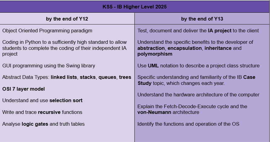 In the Sixth Form at BGS, we offer Computer Science at IB Higher level only. This allows us to deliver an extremely ambitious curriculum in which students transition to a new coding programming paradigm. As part of this, students develop an effective application written in Python for a real client. We aim for all software development work to be completed by the end of Year 12, focusing primarily on developing a deep and proficient understanding of Python programming. In Year 13, the curriculum broadens to consider the theoretical aspects of Object-Oriented Programming, the software development lifecycle, and computer hardware. Every year, higher examination involves a case study that has previously included topics like cryptocurrency, genetic algorithms, and machine learning, meaning the curriculum is revised yearly to include this information.
