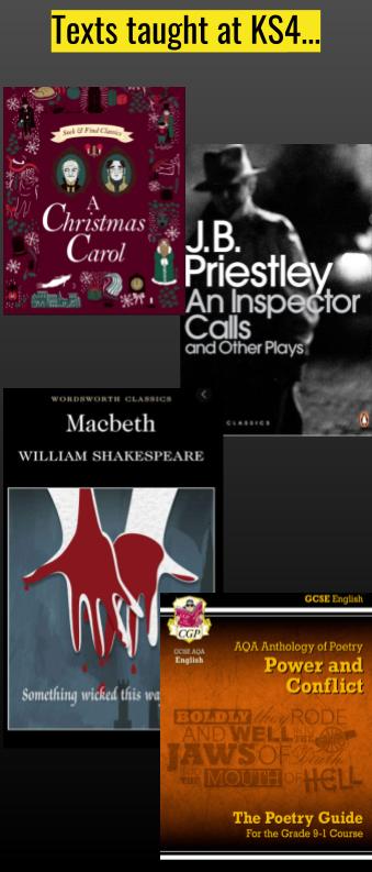 At Key Stage 4, we continue to develop the skills and interests acquired in Key Stage 3. Students are introduced to modern and more traditional poetry, playwrights and novelists from England and other cultures and more focused essay-writing and speaking and listening skills. All pupils take AQA GCSE English Literature as well as English Language.